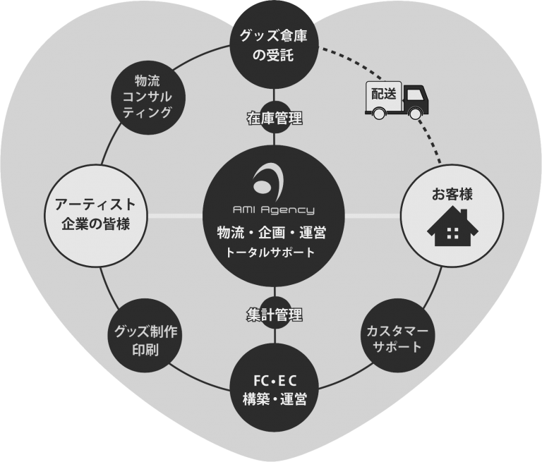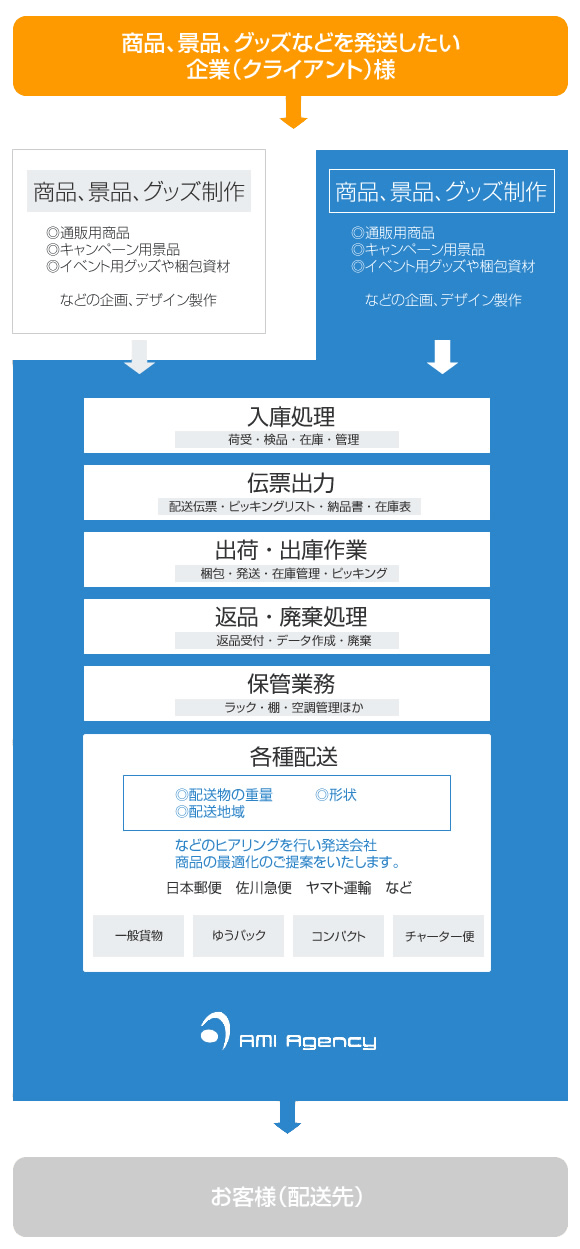 アミエージェンシー株式会社ではロジスティクスにかかわる倉庫内業務から配送業務など保管から発送にかかわる業務をご提供いたします。